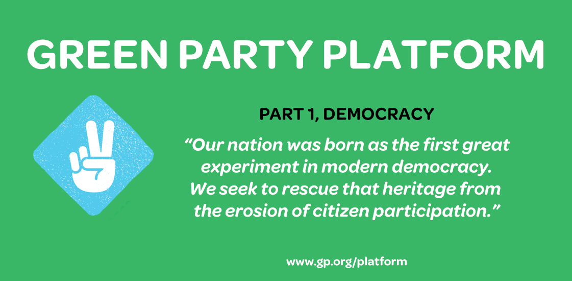 To achieve genuine citizen participation, citizens must share in the power of governing. Greens seek to bring vibrant grassroots democracy to every part of the United States.