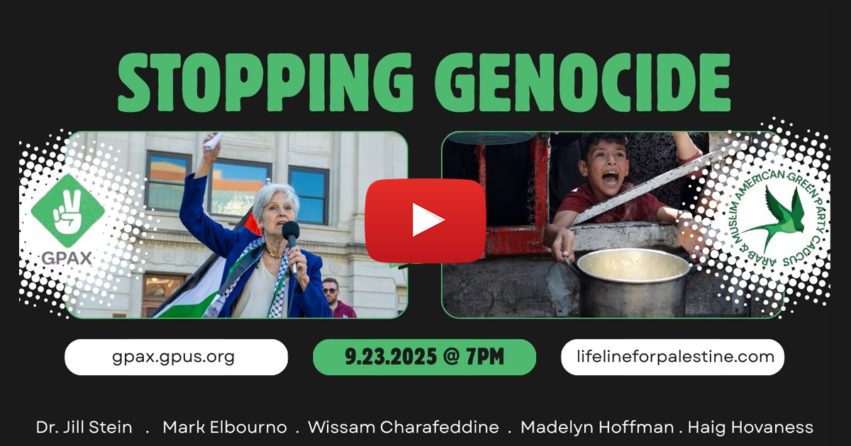 Watch an important webinar recently produced by the Green Party Peace Action Committee (GPAX) and the nascent National Arab American and Muslim American Green Party Caucus (still forming) with Dr. Jill Stein, Mark Elbourno, Wissam Charafeddine, Haig Hovaness, and Madelyn Hoffman to turn outrage into organized aid and political pressure.