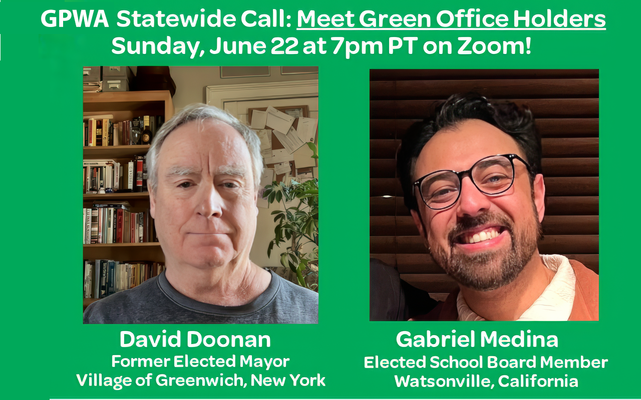 David Doonan, former Mayor of the Village of Greenwich, NY, and Gabriel Medina, current School Board member in Watsonville, CA, talk with Margaret Elisabeth of GPWA to discuss their campaigns, how they got elected and their experiences serving as elected Green officials. It's a fascinating and informative conversation! Check it out and Share it!