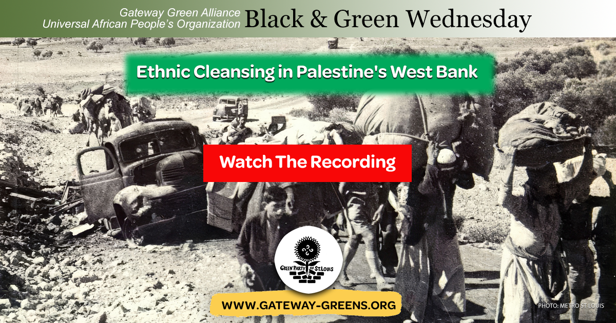 We discussed the wider context of Palestinian displacement and disenfranchisement. Steve Tamari (St. Louis Palestine Solidarity Committee) will provide an historic background of the West Bank. Michael Berg (Jewish Voice for Peace) will cover Zionist support for the ethnic cleansing. Zaki Baruti (Universal African Peoples Organization) will describe global patterns of imperialism.