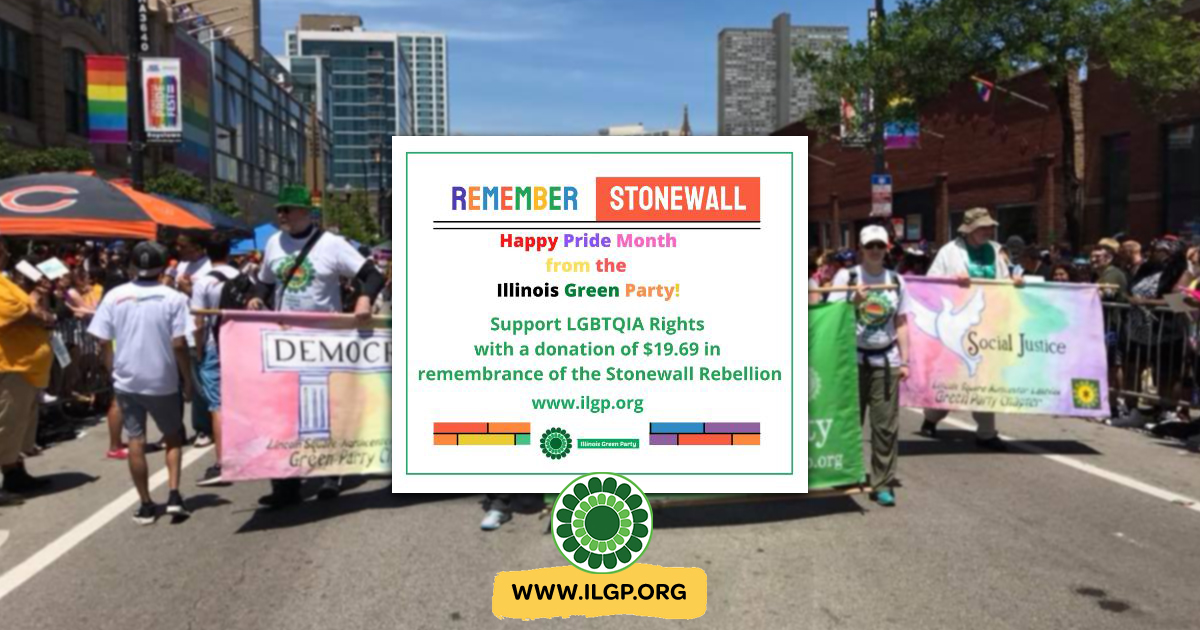 As Pride Month winds down, the Illinois Green Party remembers the anniversary of the Stonewall Rebellion. That event inspired grassroots organizations that grew into a nationwide Queer Liberation Movement known as Pride. Unlike the two Wall Street parties, the Green Party has always taken the position that we cannot compromise on issues of life or death for LGBTQIA+ (Lesbian, Gay, Bisexual, Transgender, Queer, Intersex, Asexual and other gender and romantic minority) communities. We believe that addressing the deep issues facing LGBTQIA+ communities today requires deep solutions.