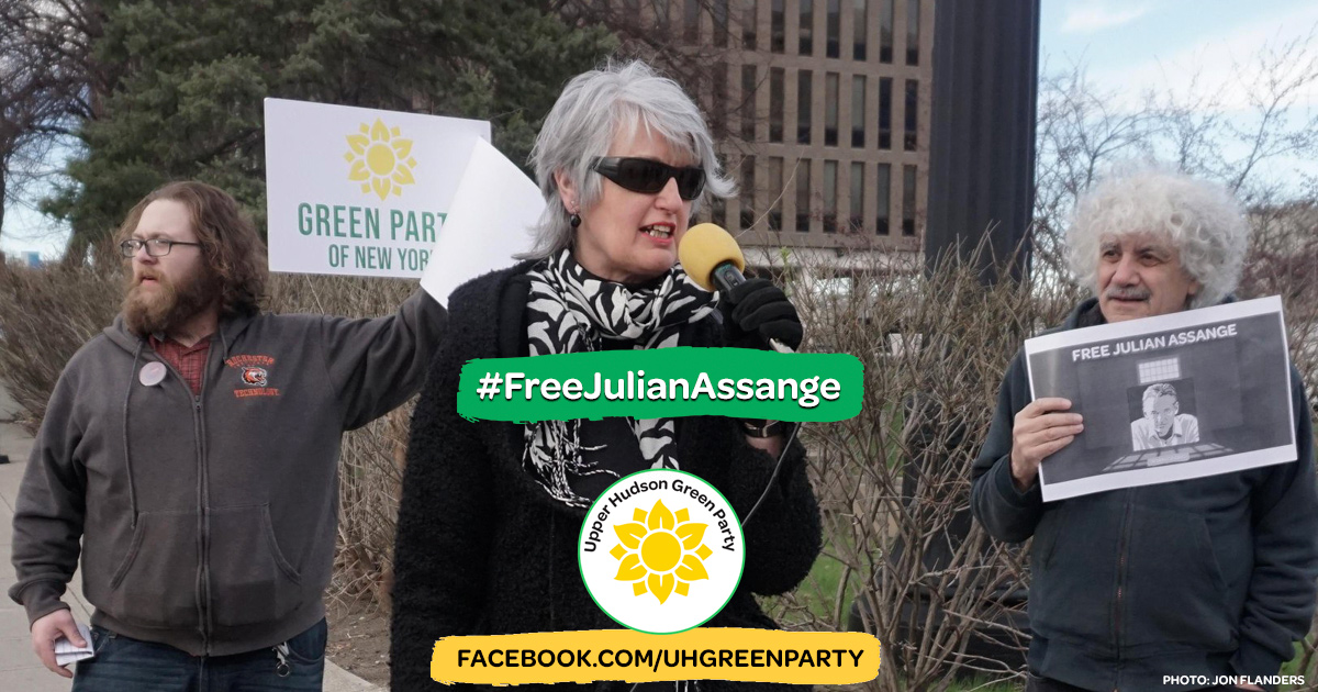 Albany, New York – The Upper Hudson Green Party rallied today in support of Julian Assange and Wikileaks, and against his imprisonment and potential extradition to the United States to face charges. These consist of aiding Chelsea Manning in remaining anonymous as she leaked evidence of grave war crimes by the United States government to Wikileaks, which commentators have pointed out is standard journalistic practice.