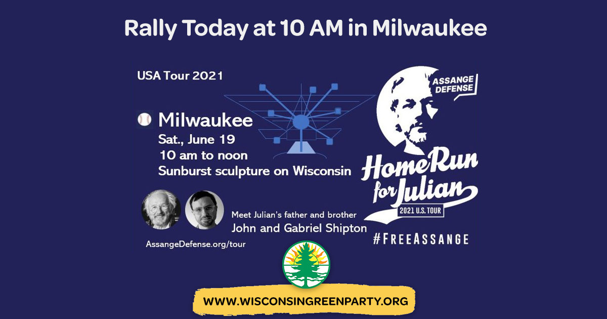 MADISON, WI – As part of the #homerun4julian USA tour to save Julian's life, the Wisconsin Green Party is joining a "Meet the Shiptons: Julian Assange's Father and Brother" – public rally outside near the Sunburst Sculpture. Chat with the Shiptons as they discuss Julian – the peace advocate and publisher currently held in Belmarsh prison as the U.S. appeals.