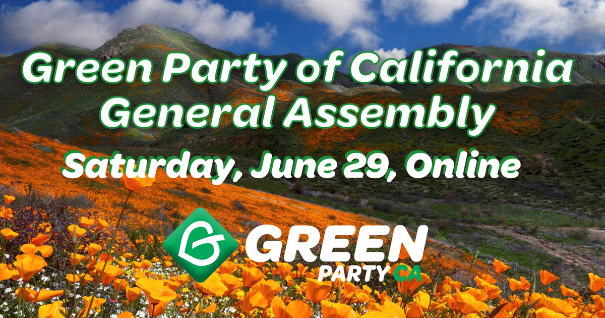 All California Greens are invited to the Green Party of California's General Assembly on Saturday, June 29, 2024. Join us to meet and connect with Greens from across California, attend presentations, and participate in discussions and decisions for our Party.