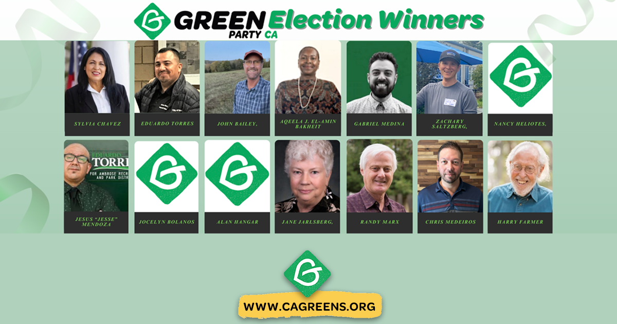 The Green Party of California is thrilled to share Green Party’s latest successes! California Green candidates secured a total of 14 local office seats: 2 City Council, 4 School Board, 5 Water or Irrigation Board, and 3 additional positions. A special shout out to Randy Marx who received the highest number of votes, totaling 2,644 for the Fair Oaks Water District, Division 4 seat in Sacramento County.