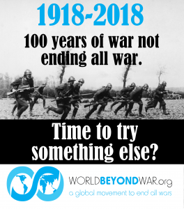 November 11, 2018, is Armistice Day 100, a century since World War I was ended at a scheduled moment (11 o’clock on the 11th day of the 11th month in 1918). For decades in the United States, as elsewhere, Armistice Day was a holiday of peace, of sad remembrance and joyful ending of war; of a commitment to preventing war in the future. The holiday’s name was changed in the United States during the U.S. war in Korea to “Veterans Day,” a largely pro-war holiday on which some U.S. cities forbid Veterans For Peace groups from marching in their parades. Trump has planned for this year a super-pro-war weapons parade — a Trumparade — for Washington D.C. on Saturday November 10th, the day before Armistice Day.
