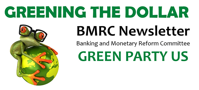 Greening the Dollar is the monthly newsletter of the Banking and Monetary Reform Committee (BMRC) of the Green Party. It aims to get Greens excited about the power and potential of the Monetary Reform plank (Article IV, Section N) in our GPUS platform.
