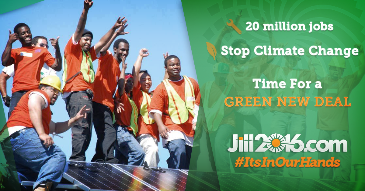 "What we really need is a WWII-scale mobilization to transition to a sustainable economy with 100% clean renewable energy by 2030. That's why I'm calling for a Green New Deal to create 20 million jobs by investing in renewables such as wind, solar, tidal and geothermal, as well as public transit, sustainable agriculture, conservation and energy efficiency. The Green New Deal will create 20 million jobs by transitioning to 100% clean renewable energy by 2030 and investing in public transit, sustainable agriculture, and conservation."
