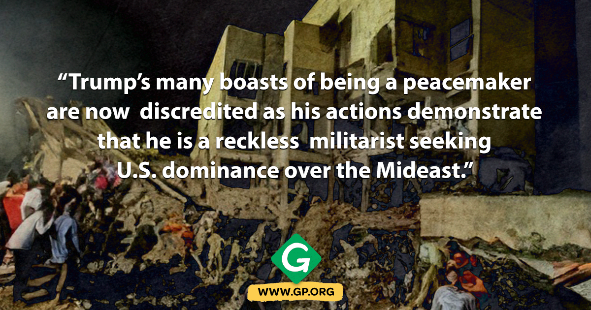 The Green Party of the United States strongly condemns President Trump’s unauthorized bombing attack on Iran and the deceptive negotiations that preceded it. "A ceasefire between Iran and Israel was announced yesterday by the US. It will last 12 hours and then the war will be over. But who knows whether the end of fighting will hold? Who knows what the next few weeks will bring?"