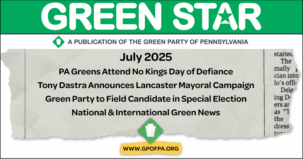 On June 14, members of the Green Party of Pennsylvania (GPPA) attended the No Kings Day of Defiance, a world-wide demonstration of outrage. More than five million people participated in more than 2,000 separate mobilizations around the world.