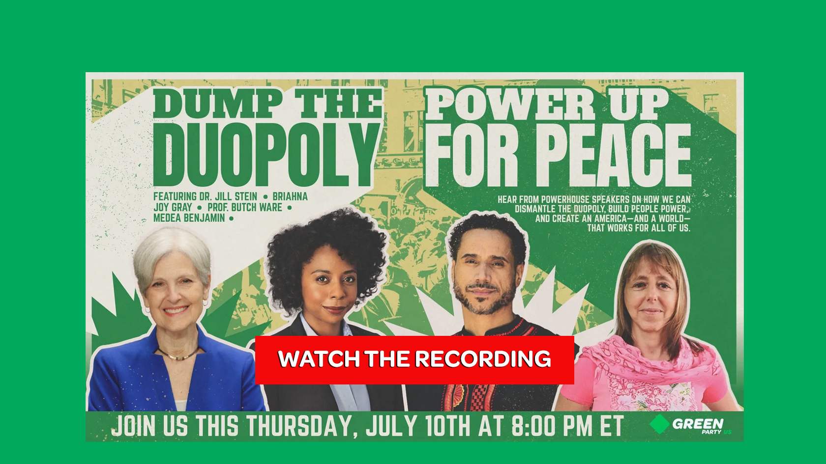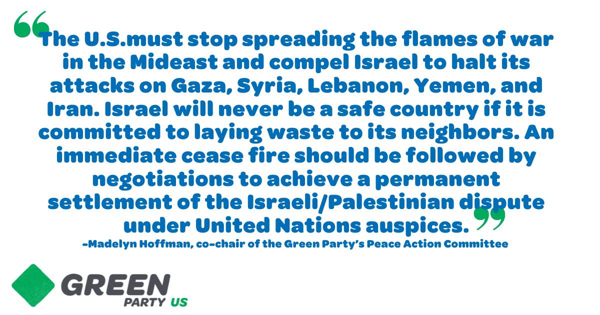 The Green Party of the United States strongly condemns President Trump’s unauthorized bombing attack on Iran and the deceptive negotiations that preceded it. "A ceasefire between Iran and Israel was announced yesterday by the US. It will last 12 hours and then the war will be over. But who knows whether the end of fighting will hold? Who knows what the next few weeks will bring?"