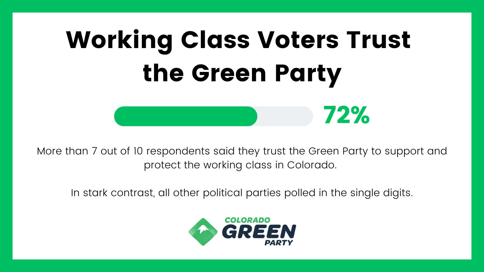 This isn't just wishful thinking—it's backed by data. When asked which party they trust most to protect the working class, a staggering 72.9% chose the Green Party of Colorado.