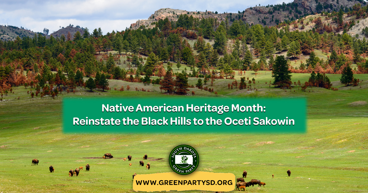 We, the South Dakota Green Party (SDGP), pen this message with a sense of unyielding urgency and unbridled conviction, calling for the end of a longstanding atrocity. As Native American Heritage Month brings into focus the heritage and history of the Indigenous peoples of our land, it also casts a harsh light on the injustices they continue to face—specifically, the wrongful withholding of the Black Hills from the Oceti Sakowin, the rightful Dakota, Nakota, and Lakota owners.