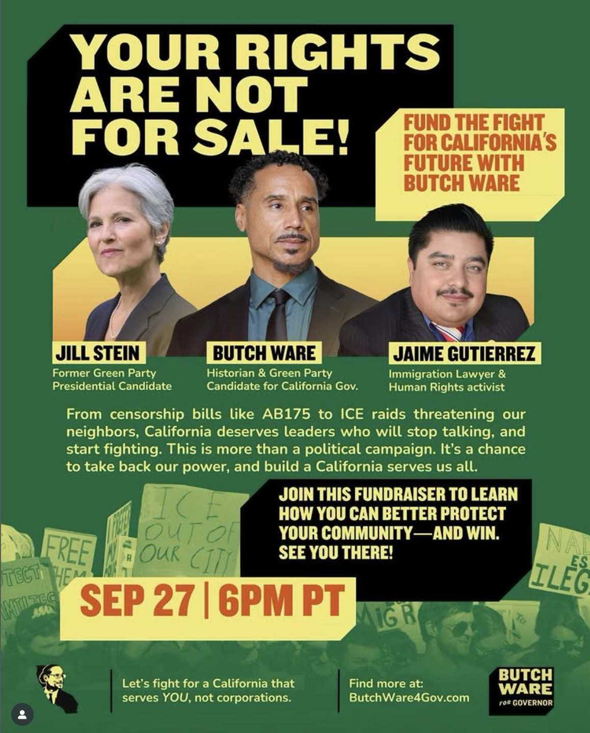 Join this fundraiser with Dr. Butch Ware, Dr. Jill Stein, and Jaime Gutierrez (immigration lawyer & human rights activist) for critical discussions about your rights and how you can better protect your community.