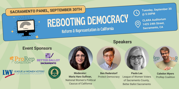 Our partners at ProRep Coalition are organizing across California to advance the movement for proportional representation. We invite you to attend their two upcoming in-person events to learn more and support our collective efforts for a multiparty democracy in our state.