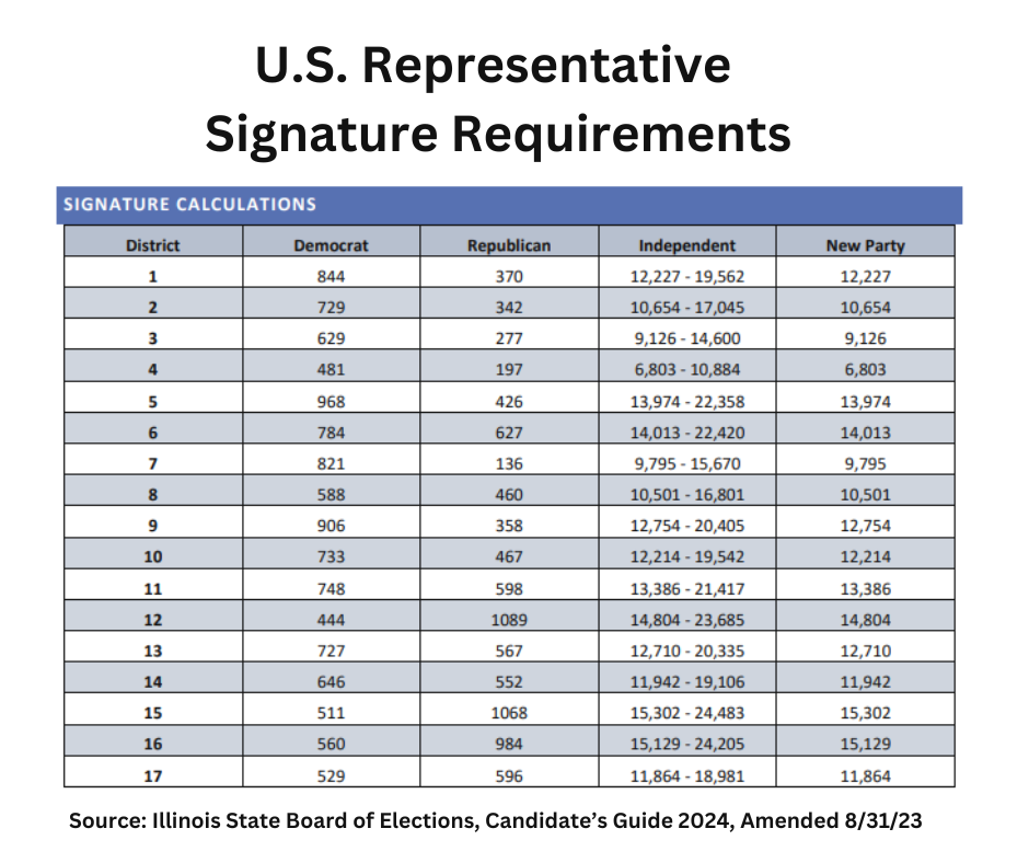 The U.S. Representative Signature Requirements from the Illinois State Board of Elections, Candidate’s Guide, Amended 8/31/23 are below.