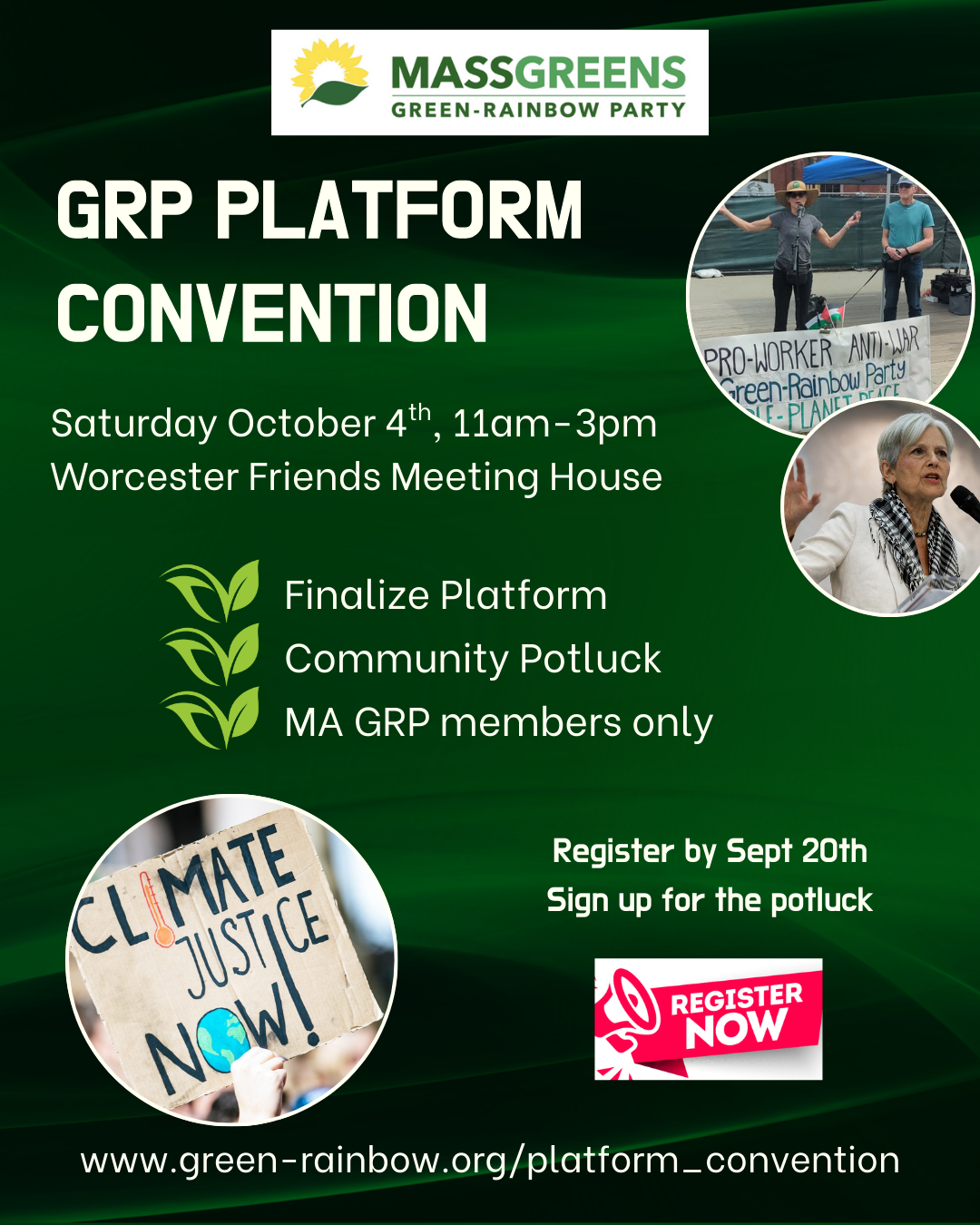 We have our exciting October Platform Convention in person coming up! This is such an important gathering of our Green community for potluck and overview of the GRP platform. This new, invigorating, and enlightening document shows that commitment we have to be the best electoral option for the people and planet!