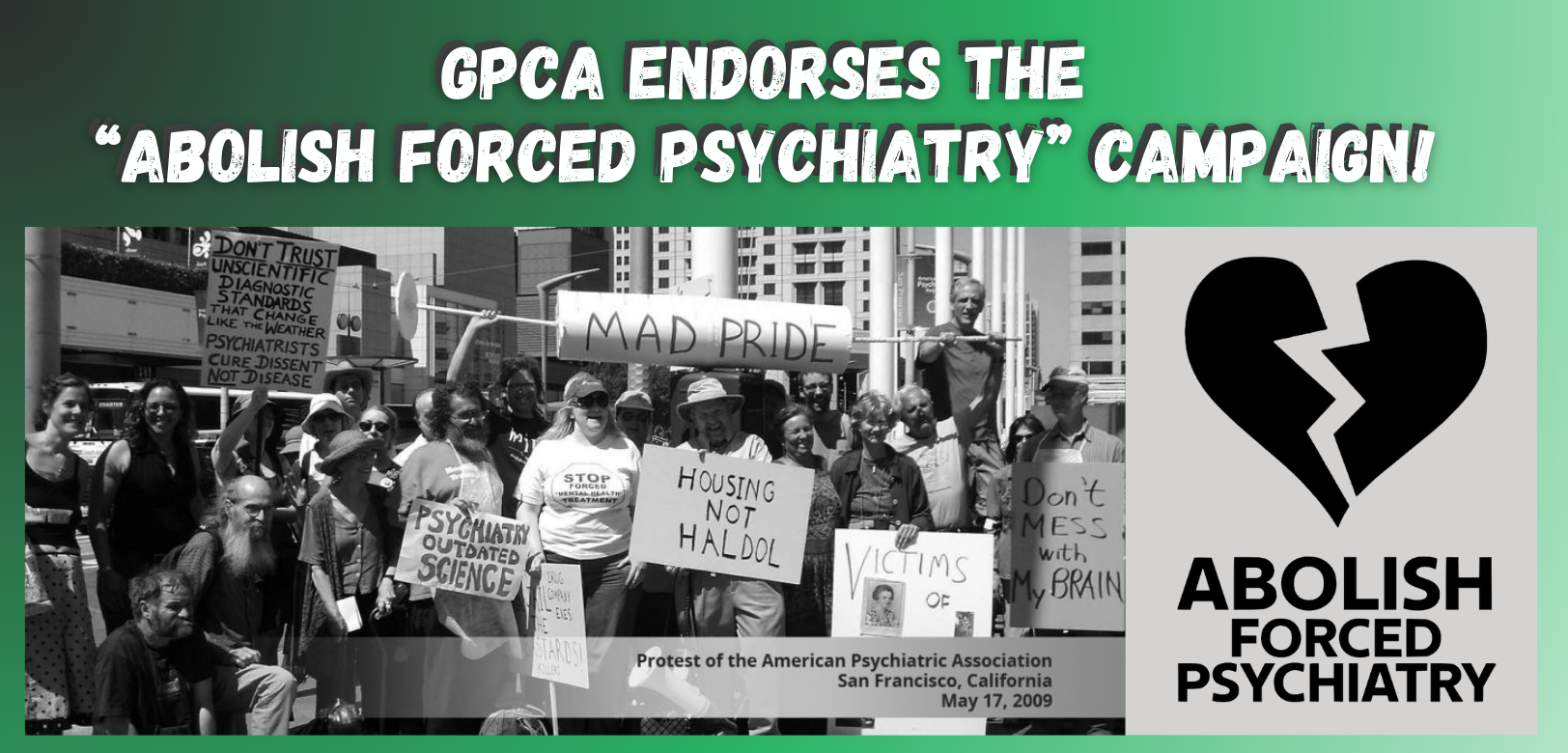 Read the GPCA's full endorsement here: GPCA endorses "Abolish Forced Psychiatry" and calls for disability justice and non-coercive mental health