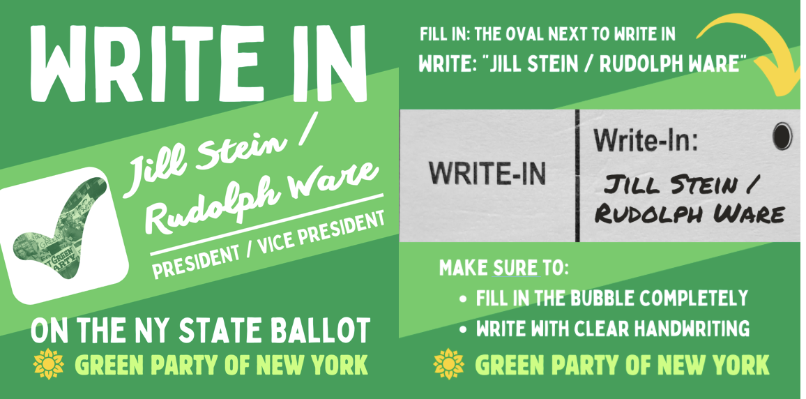 To vote for Jill Stein and Rudolph Ware for President and Vice President on our ballot, fill in the bubble for a Write-in vote, and write “Jill Stein/Rudolph Ware” in the box provided.